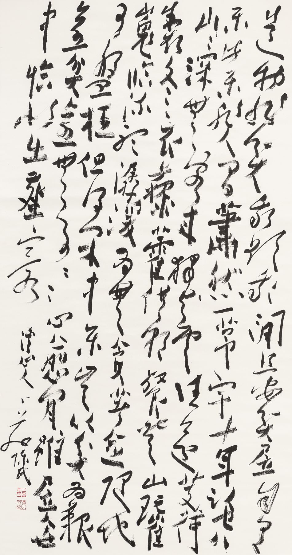 卜兹的書法奠基於長年臨習並轉化歷代名家諸體,最終方得「出古入今」,在古典裡紮根,在當代語境中繁茂盛開。除了立足古典以各種書體創作,卜兹也實踐多元的書寫形式。其中,大中堂可謂他跨入後期狂草之前,最具標誌性的創作類型。早年,他曾數次以此類草書大中堂作品,受邀參加「全國美展」。因此,大中堂在卜兹書藝中,是不可或缺的一個收藏座標。