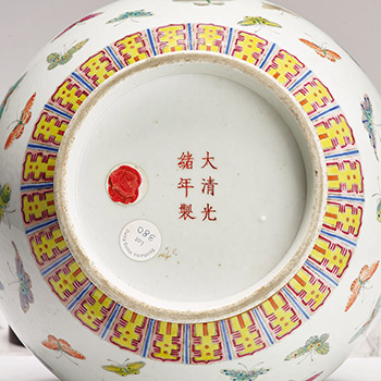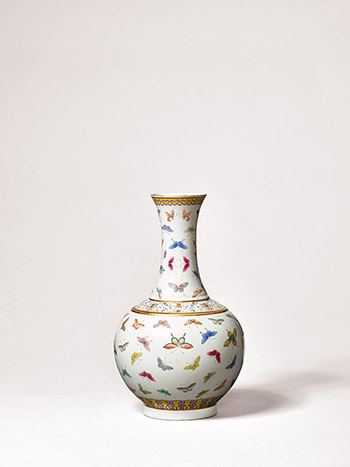 瓶撇口,長束頸,溜肩,肩部上下凸起兩道弦紋,球形腹,圈足。通體施白釉,外壁口緣下飾一圈金彩弦紋,弦紋下繪一匝粉彩如意雲肩紋,肩部上下各飾一道寬窄不一的金彩弦紋,兩弦紋內繪壽字纏枝寶相花,近底足處飾一周變形蓮瓣紋,頸壁與腹壁繪形態各異與釉色繽紛的粉彩百蝶紋,底部署紅彩「大清光緒年製」兩行六字楷書款。此類長頸球腹瓶因係清代皇帝用以賞賜群臣,故又稱賞瓶,賞瓶的裝飾花樣繁多,其中粉彩百蝶瓶是光緒朝的典型品種之一。