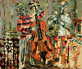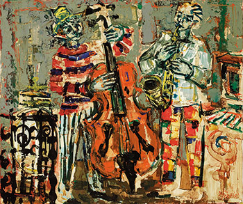 Created in the 1960s, Musicien is the perfect embodiment of the artist’s powerful individual style. The rich composition is filled with bright, vivid colors. The cello at the center acts as the visual divide, on either side of which two Jazz musicians improvise upon the street, their figures attaining a happy balance upon the canvas. The impasto technique is employed upon the musicians’ clothing and also achieves perfect symmetry in terms of color and thickness. The functionality of lines as elements of composition is weakened as blocks of color naturally delineate object contours. The garden railings on the left and street lights on the right sides of the canvas occupy the remaining space and enrich overall impressions, creating an artwork of exquisite detail and intense decoration. Aizpiri’s passion for nature and families are evident in his artworks. The bold brushstrokes and the bright colored palette he brandishes in his vibrant figurative paintings are symbolic of his joy and satisfaction in life. His recent works are painted poetry filled with a glow of love with such motifs as children, bicycles, airplanes, birds, fish and the sun, flying over the skies of Paris, Saint Tropez and Venice.