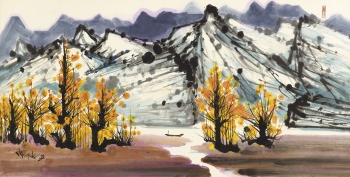 火炎山位於台灣苗栗,因山形地貌特殊,酷似火焰而得名,屬於世界奇景之一。作品《火炎山景》取景自山谷眺望火炎山。在席德進的筆下,陡峭的岩壁像一大片奇異的銀色世界,山下秋樹暖暖綻放橙黃顏色,溪流的小舟靜靜泊在中央,整幅畫面宛如雪景浮世繪一般綺麗宏偉。新的題材、新的構圖、新的意境,畫家細膩的觀察與遒勁筆力,為中國水墨畫注入新活力。