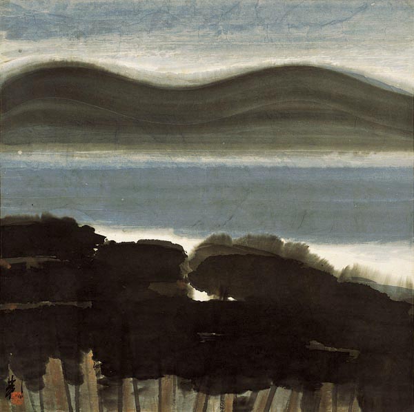 這幅《山林暮色圖》可謂是這一主張的經典證者。它的基調是水墨,意境也和傳統繪畫一脈相通。但它的色調、自然光、強調面而不強調線的特點,都和西畫有著密切的聯繫。中國畫賴以生存的骨線被抽去了「筆墨」的特質,用以重筆表現樹林的黑色在他的作品中被當作一種色彩來看待而失去了在傳統中國畫中具有的特殊意義。《山林暮色圖》構圖飽滿,濃淡的對比使畫面層次清晰又渾然—體。面的強調使整個畫面飽滿,密而通透,同時又不板不塞,山巒的起伏與天際的交匯,山的層次對應林的濃密,疏密虛實的處理上,畫家尤具苦心,實處密不透風,虛處中疏通透,使得作品疏密得當、虛實相生,暮色在此間不見暗淡,只覺溫暖。
