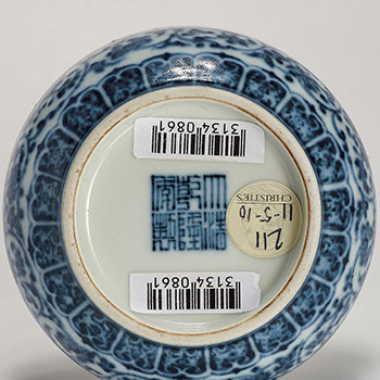 是件青花发色浓愈,纹样略显晕散,然釉水滋厚,画工精细,典雅俊美,仍称佳器。