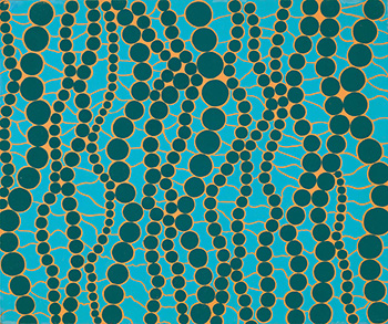 此件作品《初夏的花卉》,藝術家以黃、綠、藍三色表現出勃發的生命氣息,而這些偏執大小不一的圓點構成了一道道搖曳繽紛的花便隨風飄散,如乘載著春天的豐饒,如藝術家蓬勃不已的藝術生命力;最先賞識草間彌生的畫作《無限的網》的評論家之一唐納德.賈德曾如此評論草間彌生的繪畫:「作品呈現既複雜又簡單的效果。」觀看草間彌生的藝術,正是在這些簡單的偏執圓點之中她消彌了內心的精神苦難,將她所見的幻覺赤裸地呈現在畫布之上,造了一個引人入勝的空間和意境,透視著畫家夢幻般的精神世界,幻化成他最目眩神迷、最受世人矚目的精彩創作。