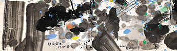 The piece “Landscape” is a painting Wu gave to a friend as a present, on lower left of the picture Wu wrote: “Life After Survival, for He Bing”. The large area of ink mark and colorful ink spots embellish in between complement the beauty of each other, create a vibrant variation of rhythm. The mood of the Chinese Xieyi (freehand brushwork in traditional Chinese painting) and the western expressionism achieve a fantastic harmony in this square of paper.