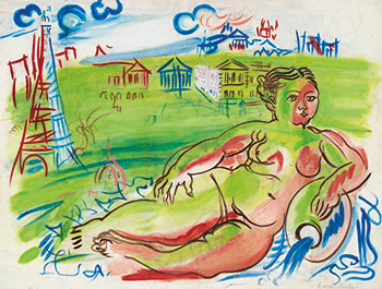 《巴黎塞纳-马恩省河》展现杜菲精巧、类似手书笔触之独到之处,柔和的用色则可见莫内、毕沙罗等印象派画家的影响。自1920年代起,杜菲经常造访威尼斯、尼斯及南法,以明亮色彩、如本拍品中书法般的笔触描绘帆船赛以及当地风光。尤其,本画中有法国普罗旺斯的明媚风光,侧卧的古典裸女左手肘优雅倚在瓶上,背景衬着一连串建筑及一座高塔的骨架。请看杜菲以透视法缩小了建筑骨架,并快速薄刷了几个色调的色彩。以用色而言,各种冷色调明亮的绿与斜倚的人像身上暖色调的红相互对比,平衡了构图。