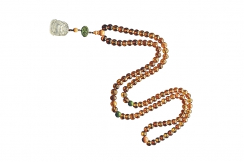 Comprising of a hundred and eight amber beads, the fota in a double gourd shape suspending a buddha pendant.
