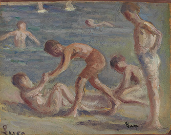 《沐浴者》為呂斯側寫戲水孩童,夏日光景一隅的精緻佳作。從地面人影判斷光源來自右方,近景四位男孩的姿態,由站立、跪坐、趨身向前至躬身倒臥,對角線橫切的直角三角形構圖,將觀者視覺自然順暢地帶動。中間男孩的橘紅色短褲,則成為畫面中心,拉開了景深,也對比出後方水面的淡藍色調。藍中帶青,青中添點紫灰,筆觸一點一點,輕輕柔柔的橫撇,舒暢暢地如畫家本人置身水中的清涼。後方的四位游泳者,呂斯僅以簡練流暢的一筆勾勒即捕捉出生動姿態,好似和風吹過,孩童們蹦跳奔跑,嬉鬧聲不絕於耳,將和煦溫暖的午後陽光就永遠停格在一瞬間。