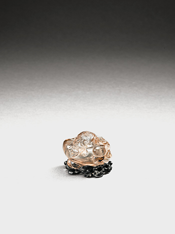 整料水晶雕成,做桃形,頂面開圓口,有蓋,蓋面浮雕枝葉紋,蓋口周緣有撞擊痾點,水丞周身枝葉環繞,器內掏膛可貯水,附紫檀纏枝靈芝底托。 是件水丞造型飽滿,精巧雅致,為文人案頭不可或缺的實用清玩。L: 8.8 cm