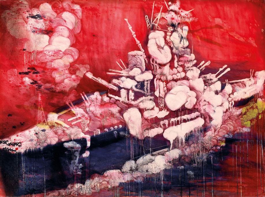 從「五花肉」系列作品來看,此幅作品《五花肉系列—肉兵器—大戰艦》是藝術家返回記憶的庫房,挖掘根源以對應於現實環境的挫折,將孩童時代對於戰爭玩具喜好的甜蜜單純欲望,以再現的方式表達成年後於海外求學時面對異國文化下的衝撞反思。這些以海軍戰艦、飛機、坦克車和潛水艇為主體的「肉兵器」,在由不同深色累積滲透出來的多層次背景烘托下,營造出一種由肉體堆疊出的異樣血紅世界。