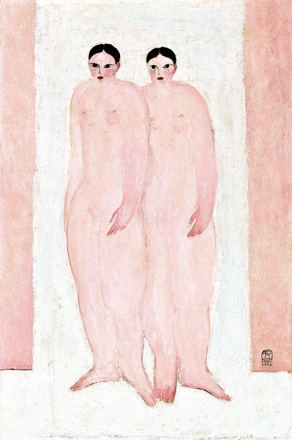 此幅《雙裸女》應該是常玉最早的一批油畫作品,畫面的右下方簽有中文「玉」字加上方框,結合法文拼音SANYU的雙語簽名,甚至少有地標示出1929年的創作年代。早年流暢的人體素描、水彩畫打下基礎,描繪裸女可說是常玉最得心應手的主題。《雙裸女》整幅作品呈現粉白、粉紅色調,洋溢著巴黎特有的情調,屬於他的「粉紅時期」。