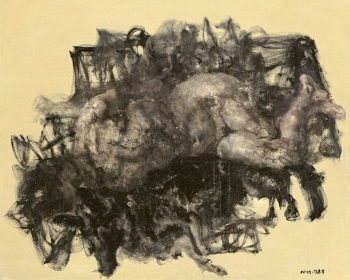 《睡美人》裡,既是生活即景,也是永恆的光陰。豐滿橫臥的裸女,是歷代藝術家一畫再畫、無法割捨的主題,周春芽用單色—當時他最喜歡的褐色作為主調,再用黑色刷出空間中的虛實輕重、女體的溫潤、黑根的俊挺。四年的時間,黑根與周春芽睡在同一張床上,有時夾在兩人中間,分享著呼吸與心跳。1999年黑根病逝,周春芽說:在他的生活中,至今最傷心的有兩件事,一是1969年他父親去世,另一件就是黑根去世。這樣濃重的感情,才得出這樣動人的作品。
