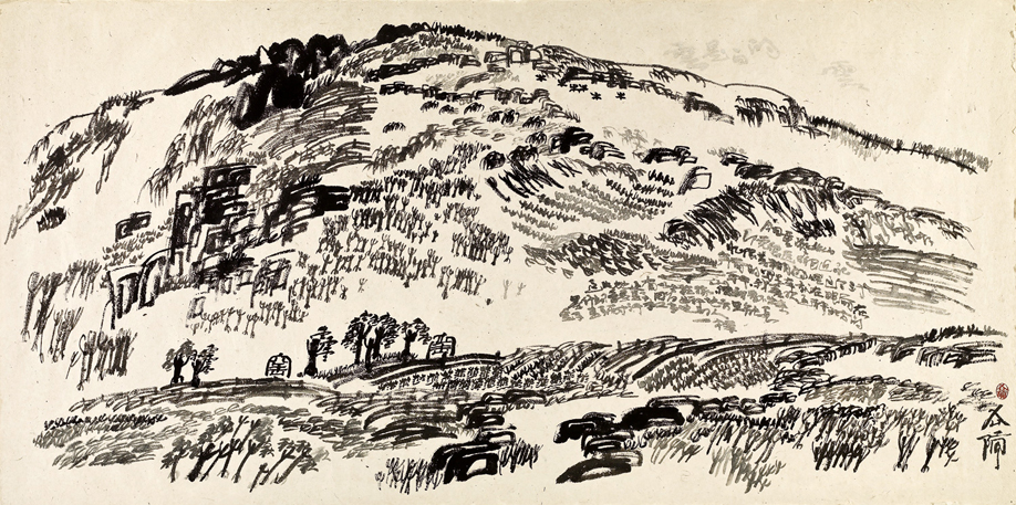 徐冰在這幅《文字山水》畫中書寫一段文字:「雲是白色的。雲。今日重遊此山印象很遠又很近。記憶很模糊,但這個三十年前的寫生本就在眼前,在手中。我喜歡這種北方的山。這片地上有一些莊稼,但我看不出來是什麼?像是豆子,因為這種地方只能長豆子。豆子耐汗和當地的人一樣。」文革期間,青少年時期的徐冰就曾赴上山下鄉去寫生,參與勞動與群眾美術運動。對於寫生這項中國畫的悠久傳統,徐冰並不陌生。1999年他受芬蘭奇亞斯瑪當代美術館邀請,進行一個月的「喜馬拉雅寫生計畫」。面對大自然時,體驗真正的寫生、閱讀風景,將創作還原到文化的本質。後來發展出的「文字山水」系列即是實踐了他的觀點,回溯中國自古以來的「詩、書、畫」融合的理想。