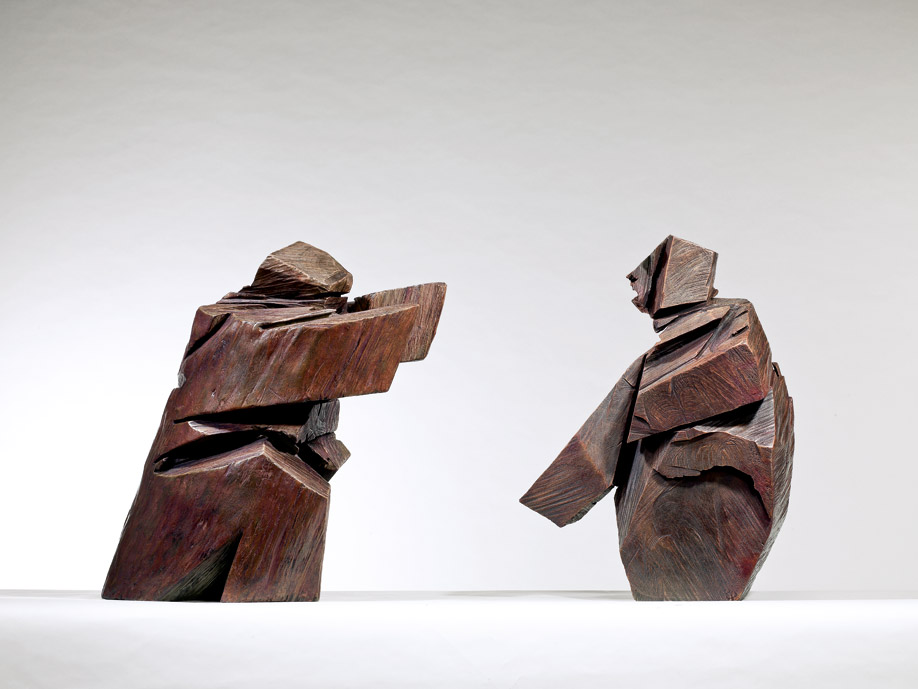朱銘的太極系列大致分為兩大類,一類展現個體的技巧與姿態,另一類則講求兩股力量之間的對立關係,也就是雙人對打。在單一人物的太極雕塑中,太極的力量和節奏透過身體的運動和姿勢來表達。但太極在本質上可謂兩極相生,即「陰」與「陽」,兩極相互關聯,循環往復合而為一,構成和諧而有力的運動。此件《太極系列—對招》動靜、虛實之間,將太極拳隨屈就伸、人剛我柔、借人之力、順人之勢的精義顯露無疑。在「太極系列」的創作探索中,朱銘經歷了從有形到無形的千雕萬鑿,其作品材質上樟木的古色古香,把人帶入到寧靜而悠遠的哲學境界。