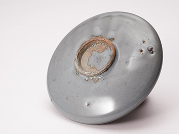 敞口,淺腹,折腰,圈足。通體光素,滿施天藍釉,足底局部不掛釉,盤口邊沿薄釉處呈醬黃色。 是件鈞窯盤造型簡練,釉色淳厚,雖無任何裝飾紋樣,卻具有耐人尋味的禪家意蘊,值得宋瓷藏家細細品味。