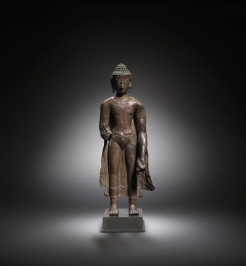 Standing with both legs straight, the broad shoulders swathed in a flowing shawl finely incised with a foliate motif along the rims and opening to reveal the bare chest, the right hand raised in abhaya mudra, the face modeled with a gentle smile, elongated eyes, and gently arching brows flanked by a pair of circular earrings, the hair arranged in regular rows of tight snail curls whorls surmounted by a domed usnisa.
