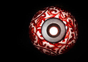 瓶為吹製而成,直口,細長頸,球形腹,圈足。通體半透明珍珠地套紅色 玻璃,頸壁前後各兩組扇形和圓形開光,開光內浮雕折枝花卉,開光外飾 纏枝番蓮紋。腹壁前後各有一個圓形開光,開光內填折枝花卉,開光外滿 飾浮雕纏枝番蓮紋。正面口沿下鐫橫書「大清乾隆年製」六字款。 是件玻璃直頸瓶,做工繁複,花卉線條翻捲自然,裝飾造詣成熟,紅白兩 色搭配巧妙,視覺效果極佳,信為清宮珍藏的宮廷珍玩。