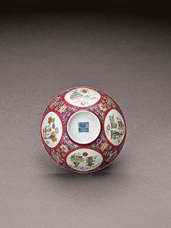 清道光 粉彩胭脂紅地軋道開光博古紋碗