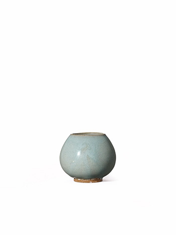 鈞窯是宋元時期北方地區規模龐大的重要窯場,其遺址在今河南省許昌市禹縣境內,自古便有「縱有家產萬貫,不如鈞瓷一片」的說法,其名貴程度可見非同一般。鈞窯作為宋代「五大名窯」之一,其釉面色澤瑰麗,玫瑰紫、海棠紅、茄皮紫、雞血紅、葡萄紫、朱砂紅、蔥翠青等不勝枚舉,器形為花盆、花盆托、鼓釘洗、出戟尊等陳設用瓷,在清宮中多有收藏。此罐斂口,圓鼓腹,重心偏下,腹壁圓弧,底部內斂,下承圈足。通體施天青色乳濁釉,釉層肥潤,勻淨淡雅。口沿處釉水較薄而微顯淺褐色胎體,圈足處露胎。整體造型敦厚古拙,素面無任何人為修飾,更顯釉色沉靜雅致,古色古香。肥厚滋潤,不失為文房案頭,清心雅玩之器。