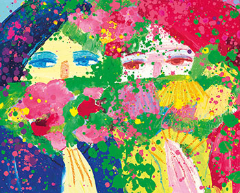 70年代起,丁氏將創作中的靈感來源、作品題材圍繞在他生命中最重要的主題─「女人」的特色儼然成形,而這股創能量在80年代達到高峰,亦成為日後藝術家的標誌,以致傳世。這幅《春天陽光》作品裡,僅見兩位女子胭脂淡抹的雙眸曖昧,手持摺扇半掩遮面,雖然不見兩位佳麗嬌嬈面貌,但從丁氏畫中瑰麗的用色,以及繽紛恣意的色彩氛圍,不難猜出女子佼好外容,宛若春天萬種風情,千嬌百態的兩朵紅花,嬌羞地綻放卻充滿自信。丁雄泉一生風流不羈,天性浪漫且多情瀟灑;他以「採花大盜」自居,留下眾多關於「女人」的多篇創作,用愛情來擁抱他見過的人生風景,時而激情如火,時而柔情似水,而他將這份熱情,轉化成璀璨,渲染力強烈的作品,同時讓我們看到他對女性的迷戀以及對生命的執著。
