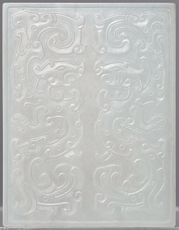 Four lush white Nephrite pieces in the form of a plaque. With the exception of the first and last plaques that each have one side decorated with an intricate high relief of two dragons, the plaques are inscribed in gold with the Ballad of the Old Cypress by an officer of Emperor Qianlong. In is like bronze, it's roots are like stone. Its frost-white bark has been worn away by rain; forty people could encircle it; jet black in colour it rises into the sky two thousand feet. Lord and minister held a timely meeting together; the tree is still cherished by the people. Clouds come and the vapour links the length of Wu Gorge; the moon comes out, and the cold penetrates the whiteness of the snowy mountains. One remembers that formerly the road wound round the pavilion east of the Jin River; the former lord and military official shared the remote shrine. The lofty trunk and branches have towered over this countryside since antiquity; hidden paintings within the doors of the shrine. Although isolated, it is entrenched in the earth; Reaching into the sky, high and alone, there is intense wind. It is supported by the power of the spirit; its uprightness originates in the work of Nature. A great building, if it leans, needs beams and poles; Ten thousand oxen turn their heads; it is as heavy as a mountain. It does not reveal its hidden meaning, yet the world is already stunned; It does not reject being felled, but who could move it? How can the bitter heart of the tree avoid enduring crickets and ants; its fragrant leaves are in the end home to phoenixes. Gentlemen aspiring to benevolence – do not complain or lament; since ancient times, talent has been hard to use. The last plaque features two two-character seals, Bi De and Lang Run. It is dated as being from winter of the Dingmao Year.