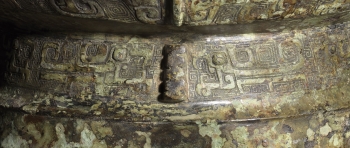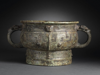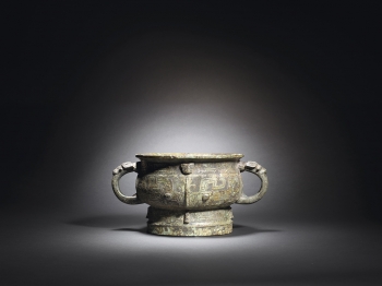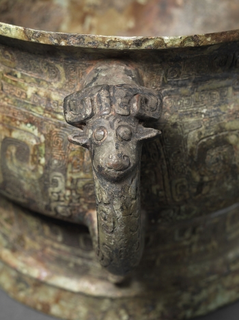The compressed globular body flanked by a pair of C-shaped handles issuing from rams head, boldly decorated in relief on each side with a taotie mask with large horns and protruding eyes in between two friezes of archaistic kui-dragons against a leiwen ground, further surmounted by a smaller animal mask in high relief at the top of a shallow flange below the lipped rim, the surface unevenly patinated and encrusted.