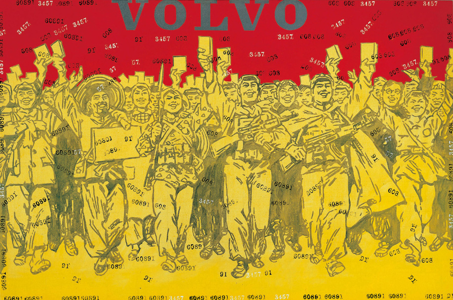 2004年完成的《大批判──VOLVO》作品,王广义批判的对象是瑞典汽车厂牌富豪VOLVO。 VOLVO成立于1927年,今日世界第二大重型汽车制造商,仅次于德国的奔驰。据报导, VOLVO从1993年进入中国消费市场,销售持续成长中。在经济全球化的浪潮下,奉行共产主义的中国早已资本化,VOLVO 的品牌响彻世界,代表西方资本市场的龙头之一。为工农兵服务的样板宣传图像,振奋人心似地高高举起宣传语录,有一种时空错置的唐突感。画面里散见印刷体的数字符号,代表着金钱的符码。商品被神化,成为一种向往的对象,艺术家在画里也进行了一场消费文化的大批判。