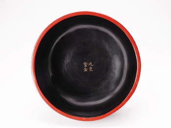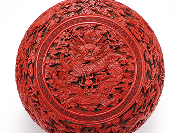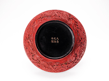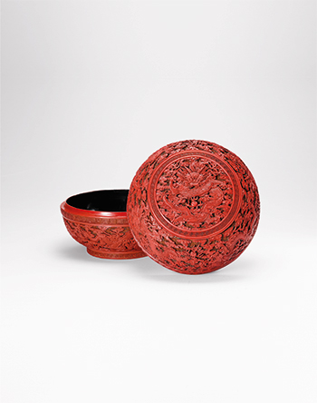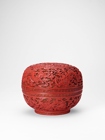 This box is tall, with a lid, and a ring foot. The entire piece is covered with red lacquer; the interior of the box and lid, and the base, are coated with black lacquer. The carved decoration on the box is in red cinnabar lacquer. Running round the top of the lid there is a continuous band of “thunder” motif, formed from twin bands of “bowstring” pattern. On top of the “thunder” pattern, on the front there is an image of auspicious clouds and dragons ascending into the air; running round the lip where the lid and box meet, there is another band of “thunder” motif, while the exterior of both the box and the lid has two sets of a pair of dragons playing with pearls; a ninth dragon is on the top of the lid. Inside the lid, towards the top, the four characters for “Nine Dragons Jewel Box” have been written on in gold. On the base, again in gold, there is a “seal impression” of six characters in the Clerical Script, in three lines of two characters each, reading “Made in the Qianlong Period of the Qing Dynasty.” The dragons with which this jewel box is decorated give it an imposing appearance. The variation in the way the clouds and dragons are depicted imbues the box with freshness and vigor; adding to this the purity of the red lacquer coloration and the skillful carving, this is without question a work fit for an imperial palace. Compare with the very similar lacquer box in the National Palace Museum in Taipei has in its collections a similar box. See Ch’en Hui-hsia, Carving the Subtle Radiance of Colors: Treasured Lacquerware in the National Palace Museum , Taipei: National Palace Museum, 2008, p. 135.