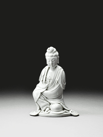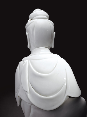 觀音呈坐姿,瓷塑。頭綰高髻,額前五綹梳整的頭髮。臉龐圓潤,眉間現白毫,五官清秀,面容慈和。身著高腰長裙,外罩寬鬆天衣,衣褶飄動如行雲流水。袒前胸,胸前垂掛瓔珞,雙臂交於右膝,右舒坐於蒲團墊上。 是件觀音姿態秀美,釉水瑩潤,背部鈐有「博及漁人」四字款。