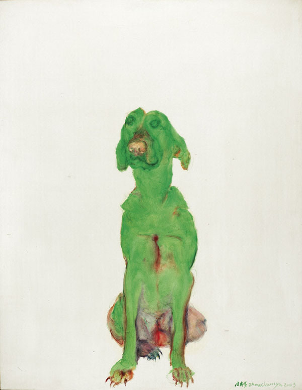 在「大綠狗」系列中,畫家進一步放棄形體的追求,直接將綠狗置於視覺中心,巨大而空曠的白色畫布上,綠色的身影、充實的質感和強烈的攻略性,令人久久無法忘懷。狗被色彩和筆觸虛擬化了,對象的存在與特徵只是通過不同的筆法提示著。綠狗或站立,或打滾,或跳躍,或行走,在畫面中呼之欲出。另一方面,綠狗已不實在,牠轉變成狗的姿態、畫面結構和畫家態度的完整整合。