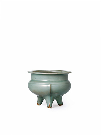 此龍泉青釉三足鬲式爐通體滿飾青釉,釉質緊密而均勻,釉層略帶透明,釉色清亮而光滑,色澤照人,器身開片滿布,直頸,鼓腹,底部略微下垂,底部三足,略為外撇且剛勁有力,而是向下漸收呈尖,設無釉尖足,有返璞歸真之氣。此器整體造型流線柔和光滑。為典型的三足鬲式爐造型。香爐,是「香道」必備的器具,造型多樣,但萬變不離其器型用意,此件龍泉青釉三足鬲式爐在保證器具用途的前提下,整體氣質淡雅,實符禮佛所需的清淨素雅之氣,不失為一件龍泉青瓷佳作。