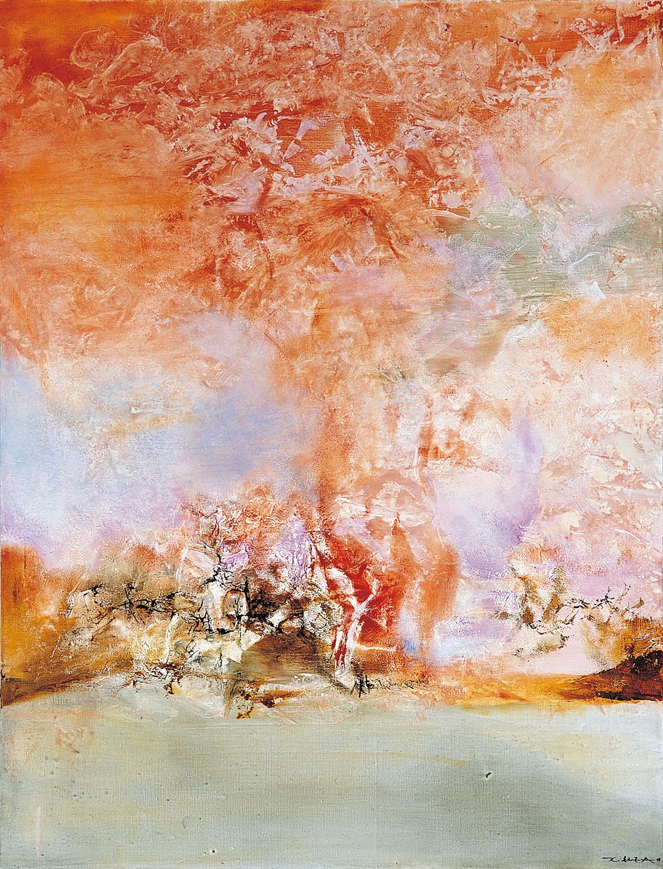For Zao Wou-ki, after having lived through the many peaks and valleys of his life to that point, the 1990s was a stage where he could gradually move toward becoming truer to himself and calmly making his way in the world. Since the 1950s, Zao had gradually established his personal artistic style. Having experienced multiple stages of metamorphosis, his style of lyrical abstraction became more mature in the 1960s. In the 1970s, he revisited ink wash, and, in a triumph for his genius, began to use ink generously in his oil paintings. And in 1981, he was invited to hold a solo exhibition at the Galeries Nationales du Grand Palais. Not only was he the first Chinese person to have had this accomplishment, this also showed that the artist had attained a place of honor. Later, at an age where, as Confucius put it, he knew the will of Heaven, Zao never stopped creating and continued to make personal breakthroughs. Around 1989, he entered a new creative stage. During this period, the artist started using a cave-like composition, covering up the center from the outside. There was a significant difference from previous works in which the mountains are clustered in the center and radiate outwards, making the center of the composition the source of power. The new approach continued into the second half of the 1990s.