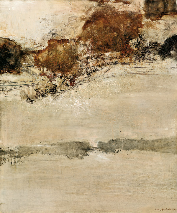 趙無極的油畫作品《11.10.78》完成於1978年,就其行雲流水的和諧畫風來看,畫家似乎仍沉浸在新婚的愉悅之中。一年之前,趙無極與結識四年的年輕博物館館員梵思娃結為連理,兩人理解彼此的工作,而成為靈魂的伴侶,何其幸福的歸宿。趙無極的作品《11.10.78》顯示出溫柔、沉穩、優雅的新文人風格,追求空間與光線的細緻表現。畫面前景平塗顏色,偶見潑彩,濛濛雲霧,撲朔迷離,意境縹緲。淺褐色幽幽抹過,空間形成上下的分野,其間乾擦出少許淡淡的飛白,大地萬物彷彿隱入煙雲繚繞中,詩意的想像無限遼闊。
