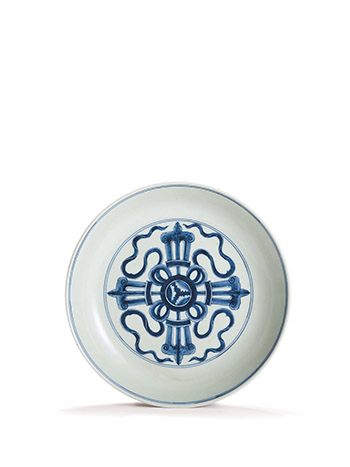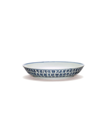 寶杵做十字排列,四出結以飄帶,故又稱十字寶杵紋或結帶寶杵紋,寶杵紋的中心做「冏」紋,冏紋據悉是源於一種神祕的青銅紋樣,又冏與金文中的「明」相似,敢情也有光明的意思。官窯瓷器上的梵文最遲自明代即有,類似的青花寶杵紋盤,雍正年間時有燒製,惟目前傳世青花寶杵紋盤的直徑一般尺寸小於二十公分,相形之下,諸如本件青花盤的直徑逼近二十六公分,抑且畫工工整、發色濃郁的特殊品種,自然是彌足珍貴的稀罕精品。