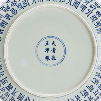盤敞口,弧腹,圈足。外壁近口緣與近底部處各飾兩圈青花細弦紋,兩組弦紋間繪三層梵文,梵文排列有序,共計一四七字。盤內壁近口緣與盤心外圈處亦各飾兩圈細弦紋,盤心細弦紋的開光內,繪飾青花十字結帶寶杵紋。又圈足外壁牆亦飾兩圈細弦紋,底部圈足內署青花雙圈「大清雍正年製」兩行六字楷書款。