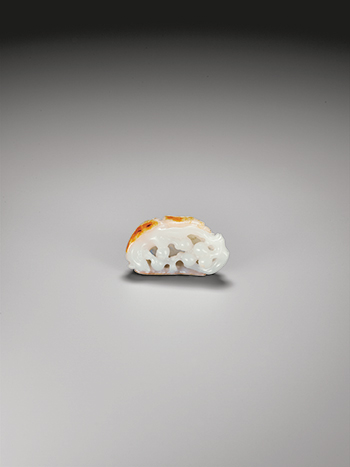 整料和闐子玉雕就,玉質甚佳,局部有褐色原皮。以透雕技法將紋樣以外的原石肌理剔除,形成通透靈動的視覺美感。全器做松鼠爬行於葡萄枝幹上,一面表現碩圓的果實,一面利用天然皮色表現蔥鬱茂葉,兩者對比鮮明,予人輕巧明快的強烈律動。