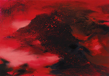 此幅《山之嶺》,在黝暗厚沉的塊體周圍,有紅光迷漫繚繞,彷彿從山體背後,即將透出一道新的光芒。如在一片混沌的宇宙中,現出山巔浮日之感。張淑芬曾提到,她曾於清晨時分在尼泊爾山上打坐,面對著喜馬拉雅山脈的稜線。看著晨曦從山稜後方一點一點的浮現,天色也由幽深暗沉漸轉灰白,而後漸透道道紅光,隨即迷漫整片天際,此幅《山之嶺》宛若此次深刻記憶的浮現。然而畫家已經打破「像」的執著,抽離具體的成分,提煉出純粹的色彩與線條。然而卻又在張淑芬筆下,重新凝聚了一種更富詮釋的「心象」。畫面中一片紅光迷漫天際,「對眼睛而言什麼顏色都是合理的,所以我可以用色用筆毫無顧忌。說他像山,就是山! 」而且,《山之嶺》畫面渾融一體,似有氣息流動其中,自有一種元氣淋漓之感,令人稱歎。
