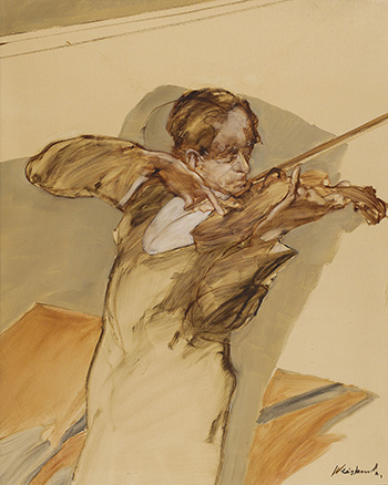 作品《小提琴手》是藝術家克勞德.維士巴修所擅長的速寫式的繪畫,畫面中的音樂家身體前傾,左手扶著於小提琴之上,右手持琴弓,面容表情雖沒有被精細描繪,卻能深刻體會到其神情凝聚、自若儀態,焦點集中於演奏之上。筆觸流暢地與背景交融,簡化細節處,並交待了空間感之深遠,使觀者仿如身置其中,時空在靜謐的畫面中隱隱流動著。小提琴手陶醉於音符的狂熱音樂家,流轉的線條與純褐色調的巧妙相遇,瞬間定格了人物運動間的影像,以近似照相重複曝光的方式表現人物動感。他準確地描繪了演奏人一舉手一投足,生命之美隨著純粹線條被瞬間凝結為永恆。