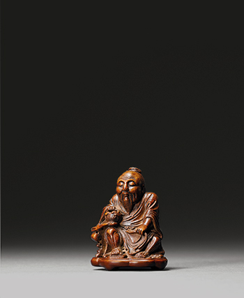 This carving, made from a bamboo root, depicts a sage wearing a headcloth, with a wrinkled forehead, protruding hip bones, a long beard and busy eyebrows, and a thin, spare face. The sage shoulders are slightly hunched; he wears a long gown with a crossed collar, tied at the waist by a cord. His left arm hangs down loosely by his side, holding a bag, while his right arm is raised, holding a basket which contains the medicinal plant glossy ganoderma and other plants and flowers. He is resting on an exquisitely shaped stone, with his knees bent and right foot raised. This bamboo carving is superbly executed in a way that brings the subject matter to life. The basket of glossy ganoderma that the sage is carrying has auspicious connotations of long life.