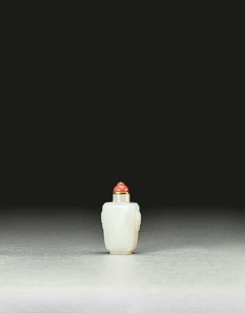 Carved from Hetian jade, the quality of the stone is exceptional. With a round mouth, straight neck, shoulders, and rectangular abdomen, lines are carved into the edges of the abdominal surface, which gradually closes downwards. The flat bottom is held up by a short rectangular base. The body emits a shiny luster, while two rings in the shape of beasts are embossed on both sides of the abdominal near the shoulders. The whole body is glazed with graceful lines and the concise work reveals very fine carvings. This snuff bottle features highly artistic qualities.