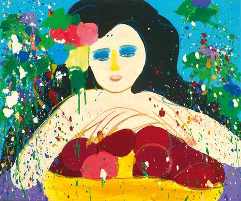 大膽利落的線條勾勒,手法流暢帶點不羈的狂野自信,宛若野獸派的灑脫奔放,而其畫中女人 慵懶不扭捏的枕著背,泰若自如地呈現女性姿態的優美;背景充滿力道的顏料潑灑、滴流等抽 象表現主義的影子融合高彩度的色塊塗抹,則迸發出藝術家旺盛的創作能量以及川流不息的生 命力,更是丁氏最簡潔有力且獨到的藝術語彙,滿溢著美好的氣息。此件作品承襲了古典主義 以來的畫作構圖,從堤香、馬奈、莫迪里亞尼至馬諦斯等等,皆以此類似的造型創作過無數經 典佳作,而丁雄泉將古典畫作姿態轉化成內心最澎拜、最狂熱的熱情,絲毫不減的將內心渴望 赤裸地呈現在世人眼前,也因此成為那個時代的真藝術家。