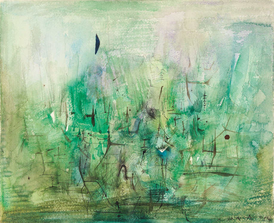 創作於1954年的水彩作品《綠色抽象》,畫中穿梭著文字書寫般的符號,藉由這些神祕的符號,畫家賦予一種暗示,其中也潛藏著悲壯的戲劇張力。在一片墨綠色的自然裡,細小的線條翻騰,色塊躁動,象徵著花園裡的不安狀態。這處心靈花園或許是荒蕪了,因為人的離開,畫中充滿藝術家的惆悵思緒。人的離開,指的是與家園父親的分別,也可能隱喻著自己情感的變化,妻子景蘭即將離去。趙無極是一位情感纖細的藝術家,繪畫乃是生活的指標,更是生命的重心。