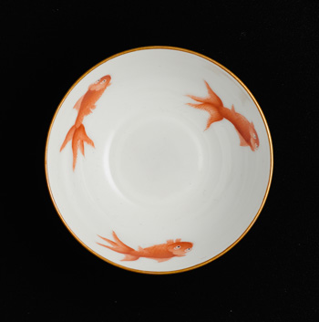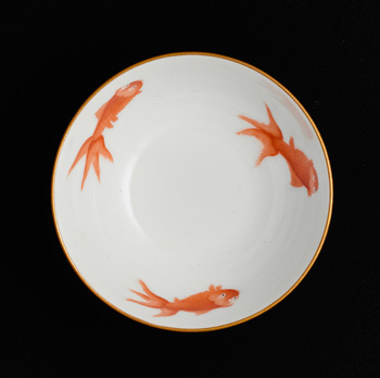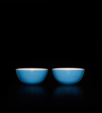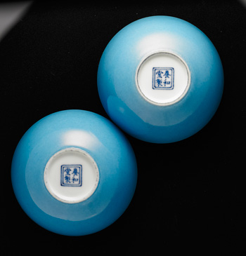 杯敞口,深弧腹,腹下漸收,圈足。碗裡施透明白釉,透明釉上繪三尾金魚,口緣飾一圈金彩,外壁罩天藍釉,釉色如雨過天青,予人晴空疏朗的韻致,底書青花雙方框「養和堂製」雙行四字楷書款。據清人許之衡《飲流齋說瓷》一書載:「瓷款之堂名、齋名者,大抵皆用楷書,製品之人有四類,一為帝王,一為親貴,一為名士而達官者,一為雅匠良工也。」又,「養和堂」位於圓明園內,建於雍正四年。