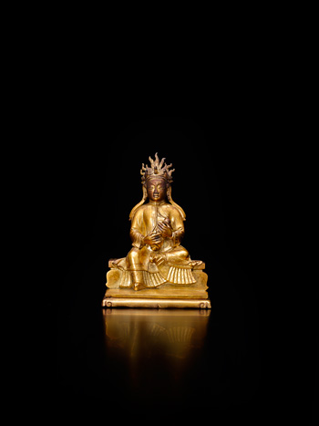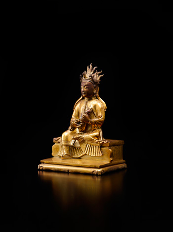 觀音頭戴鳳冠,耳後巾帶垂掛兩肩,法相莊嚴。身著高領對襟長袍,袍襟鐫花式錦地,衣袍貼體,雙臂當胸,手捧嬰兒,開右襟,作哺乳貌。下半身袍衣內著長裙,翹右足,舒坐於四方高台上,足踏四方矮几。是件鎏金造像,形象稀罕,鎏金厚實,或以為是送子觀音的特殊藝術類型。
