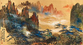 He once said, Yellow Mountain is a truly beautiful place and a veritable natural museum of sculpture – I never grow tired of its scenery. There is stillness in moving things and a sense of movement in still objects. Gorgeous peaks, unusual stones, and lush pines seem still, but are instantly brought to life as a bank of wandering clouds rolls in. Yellow Mountain is magnificent and steadfast. Yellow Mountain has an almost indescribable aura of mystery surrounding it. Each time I visit, I am inspired in a different way. The subject matter for painting scenes of Yellow Mountain is inexhaustible. Yellow Mountain is my teacher, and its beauty inspires me to create many artistic works. When I gaze out at the ever-changing clouds and interplay of light at Yellow Mountain, I see ink and color splashing across white paper. Yellow Mountain taught me the splashing ink and color painting method. Golden Landscape – Yellow Mountain, was created in 1983 after Liu’s ninth visit to Yellow Mountain. The splashing ink and rich colors make this fantastic painting a highly representative piece from Liu’s portfolio of work centered on the theme of Yellow Mountain.