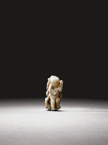 珮呈板片狀,白玉雕成,通體滿布沁色,典雅斑斕。童子頭綰包髻,杏眼濃眉,蔥管鼻,身著肚兜,右臂垂於腰際,左臂高舉過肩,手持蓮荷,另童子一旁更有瑞獸恃立,表徵喜氣意象,是同類器中較為稀罕者。宋代流行執荷童子,蓋因「蓮」荷、童「子」有喜得連子或連生貴子的吉祥瑞兆。H: 6.8 cm