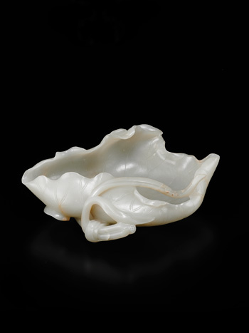 Exquisitely worked to the form of a folded lotus leaf, the exterior with additional conglomeration of lotus blossoms and leafy tendrils issuing from a curved undercut stems forming a root. The lotus is indigenous to ancient China and the present lot skillfully render the flower and its various component, including its petals and stems, unopened, Zhou Dunyi (1017-1073 CE), the writer of a well-known essay about lotus, referred to the elegant plant as ‘the flower of purity and integrity’ since it emerges from mud but the beautiful form of the lotus remain unstained while it grows. Compare with a very similar vessel worked in the form of an elegant lotus leaf from the Palace Museum in Beijing, illustrated in The complete collection of treasures of the Palace Museum, Jadeware II, Shanghai, 2008, no.187, p.226.