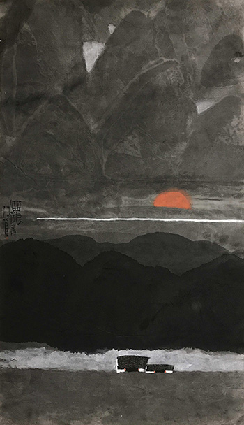 晨曦晚霞飄掛着薄霧,黑瓦白牆的小屋綿蜜的對話,唯獨紅日欣賞,構成世間簡約純美迷人的世界。水禾田除了是一位攝影大師外,更是一位知名畫家,水禾田運用攝像機去捕捉人與景已經超過三十多年,作品已是深入民心,經常體驗大自然的他,深度地提升出山水的精華,用極具魅力的技巧,描繪下他內心的景觀。該畫作一反正常描繪山水的主題畫的表現方式,在這裡水禾田先生使用墨色中的灰黑色調來表現其內心的山水,讓畫面更加的寧靜,安逸,晨曦中,一點點紅日探出頭來,聽溪流潺潺、沐鄉風徐徐,享受你詩和遠方的假期,行走在大山的懷抱裡,每當晨曦初現,又是新一天的開始,縱使再有滿身的疲憊也消失一空,如此美好的境界,正正是作者想帶給觀者的美的享受。