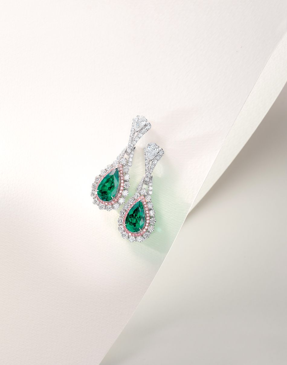 1.68克拉及1.74克拉梨形哥倫比亞祖母綠配粉紅色鑽石耳環 MUZO礦區,無浸油,附MUZO、SSEF證書