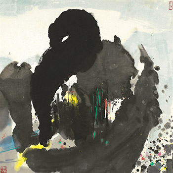 “A Heap of Stones” is an artwork of grandeur and vigor created by Wu Guanzhong in 1982 and which fully embodies the progression of his artistic career in the 1980s. During this period, Wu began employing the splash-ink freehand style and experiencing the joy and exhilaration of traditional Chinese brushwork. This resonates with the blossoming of postwar Western abstract expressionism, particularly the automatism of the drip technique. Composed of several large and heavy lumps of ink, “A Heap of Stones” encapsulates the majestic peaks of a fantasy realm manifested through solid swirls, powerful splashes and textured layering. Encircled by large masses of ink, a cavern seems to be formulated in the center from which emits the delicate luster of red, yellow and blue. The varying strokes appear to be free and spontaneous yet culminate in a compelling, vibrant dynamism that seems to penetrate and resonate throughout the vast, boundless space. The cluster of ink and color dots on the lower right of the painting bears high resemblance to jagged rocks piercing through swashing clouds. Underneath the clear blue sky, the entire mountain, unblemished and aloof, stands erectly in majestic exaltation.