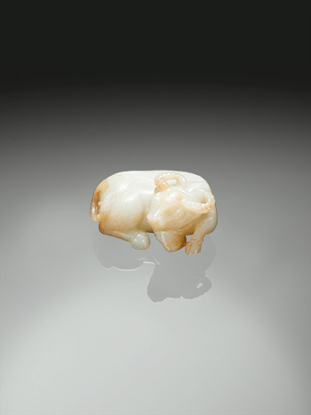 整料和闐白玉雕成,局部有褐色斑。玉牛做側首伏臥貌,額頭上飾有漩渦狀陰刻紋,雙眼水汪,雙角向後屈曲,兩角間脊骨凸出,脊線延伸至尾部,長尾上捲並輕置臀部。背上一條紐繩穿繞鼻部,蹄足碩腿,肋骨畢露。全器造型準確,形神兼備,具有感染人心的藝術魅力。L: 7.5 cm